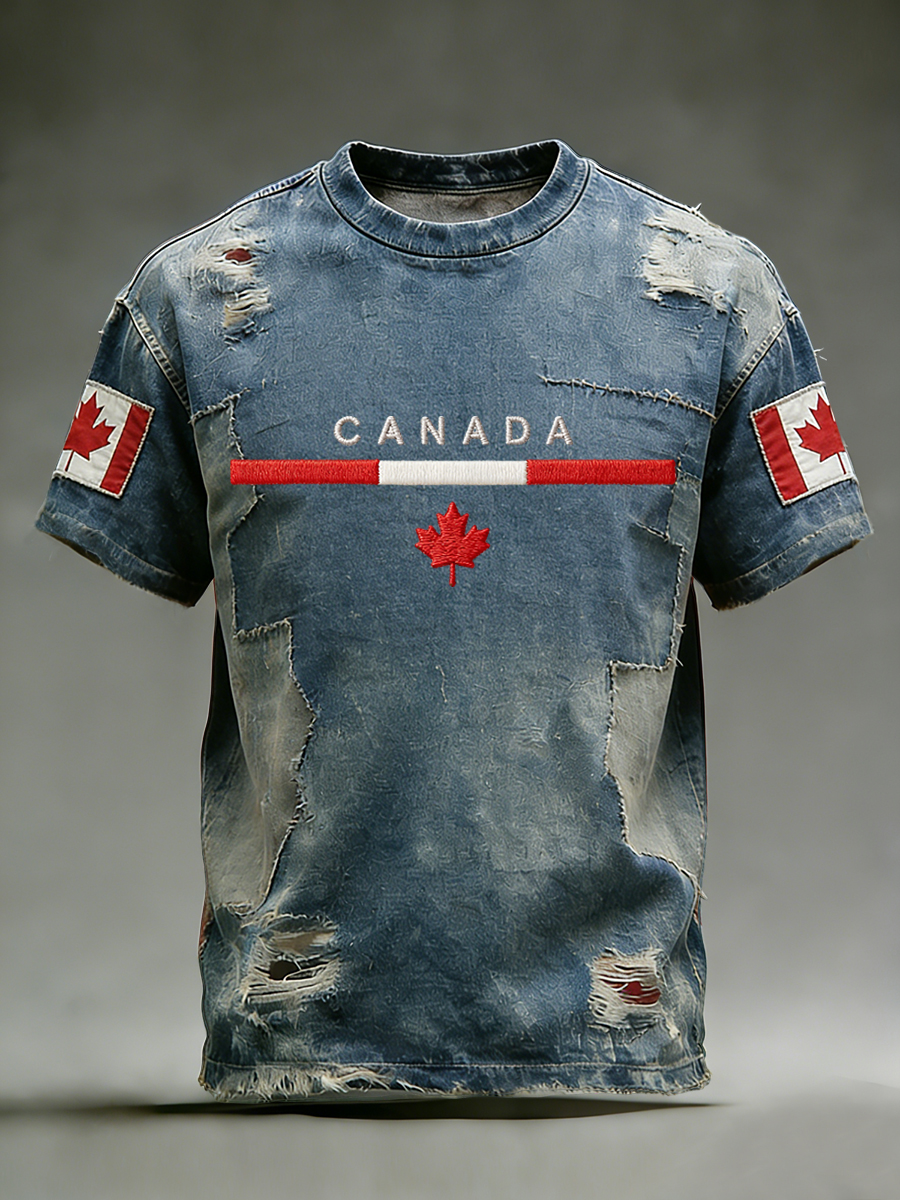 Retro Canadian Maple Leaf Patchwork Casual T-Shirt