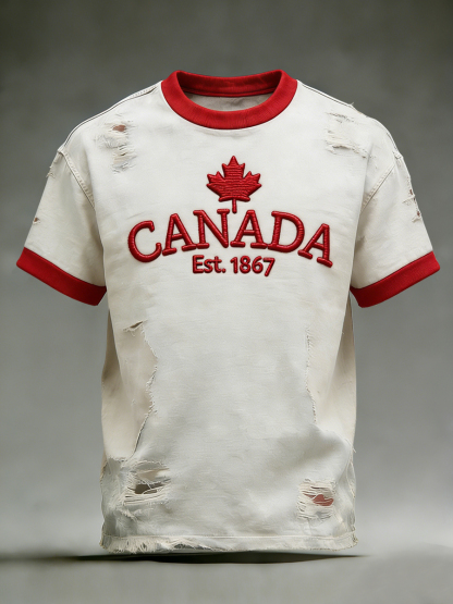 Retro Canadian Maple Leaf Patchwork Casual T-Shirt